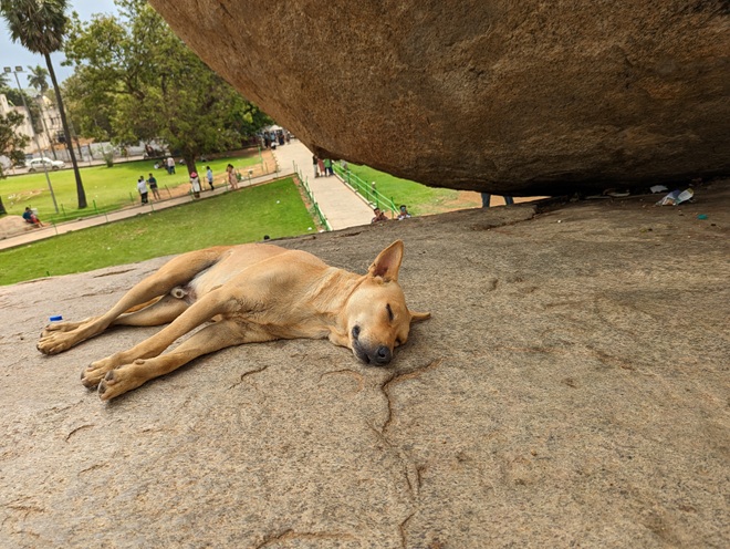 この方はマハーバリプラムの巨石の下でおくつろぎです。