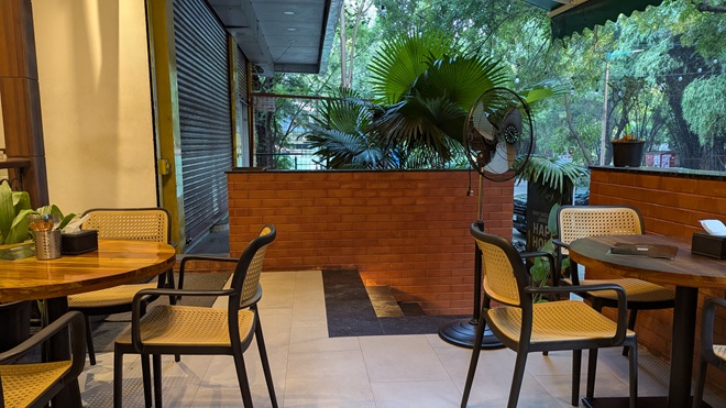 ドアや窓による外界との仕切りのない半屋外タイプのカフェで、開放感あふれる店内となっている。