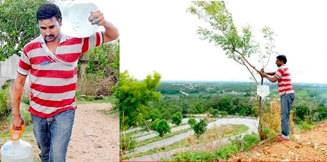 40歳になるラメーシュ(Ramesh Y)さんは5年の歳月をかけ、有名な巡礼地ヴェンカタラマナスワミ(Venkataramanaswamy)寺院周辺のカリガッタ(Karighatta)という丘陵地帯で、樹木や植生がまばらとなった土地を、たったひとりで緑化している。
