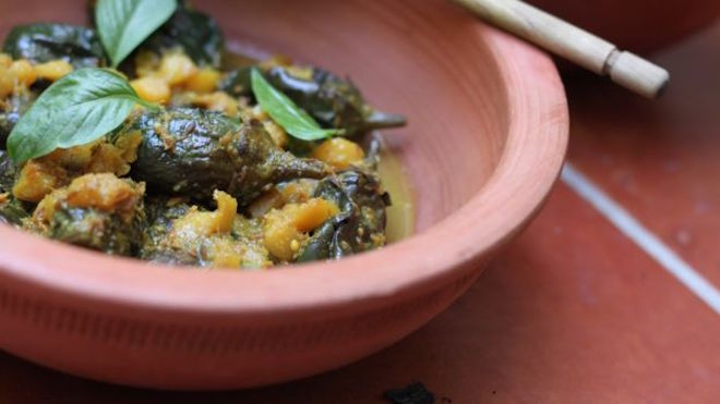 遺跡から発掘された「カレーの原型」は、ナスとターメリック、ジンジャーのみを材料に、塩だけで味つけられたと考えられているが、このレシピでは、その時代に入手できたとされる材料も加えた、多少リッチなものとなっている。