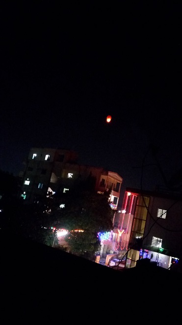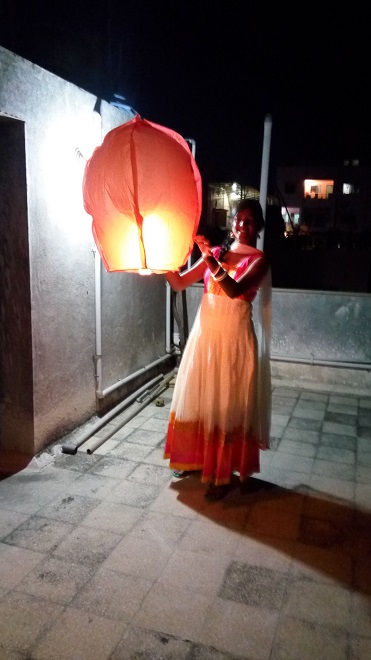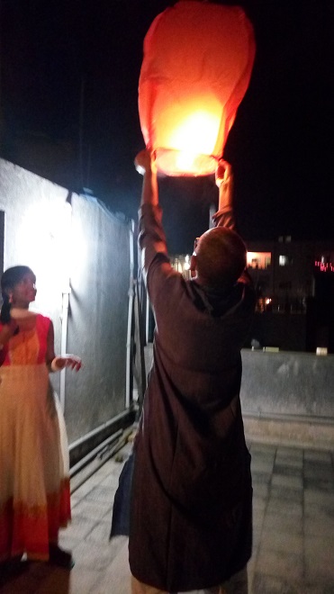 プージャを済ませたら自宅の屋上へあがり、先日亡くなったお祖母さんと、下の姪シッディちゃんによれば「マミ(伯母、わたしのこと)のお父さんへ」と、点火したら小さな気球のように静かに空へ飛んでいく紙製のランタンを2つ灯し、みんなで見送った。