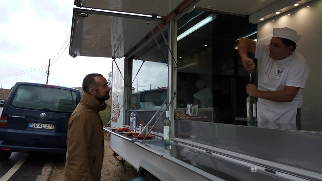 ランチは、絶品ショリソー・サンドイッチと緑ワイン「ヴィーニョヴェルデ」を、これまた絶品チーズやチェリートマトと一緒に、市場にある屋台(バン)で立ち食いという新しいスタイル。