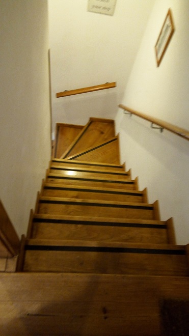 外出時は、このような急峻な階段を降りて玄関へ至る。