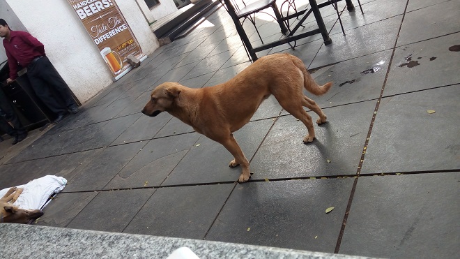 ここで飼われている老犬くん(左端で寝てる)のお友達の野良くん。