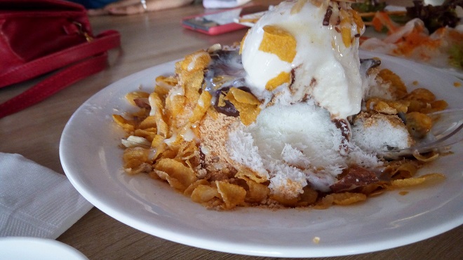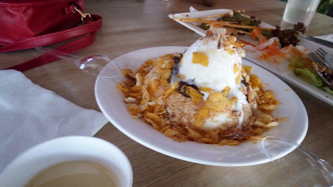 日本のカキ氷やタイのアイスカチャンのように、氷自体に味がついていないタイプでなく、ふわっふわの甘い氷で、けっこう満足感はあるものの、ひとりで食べるとカロリー高そう。