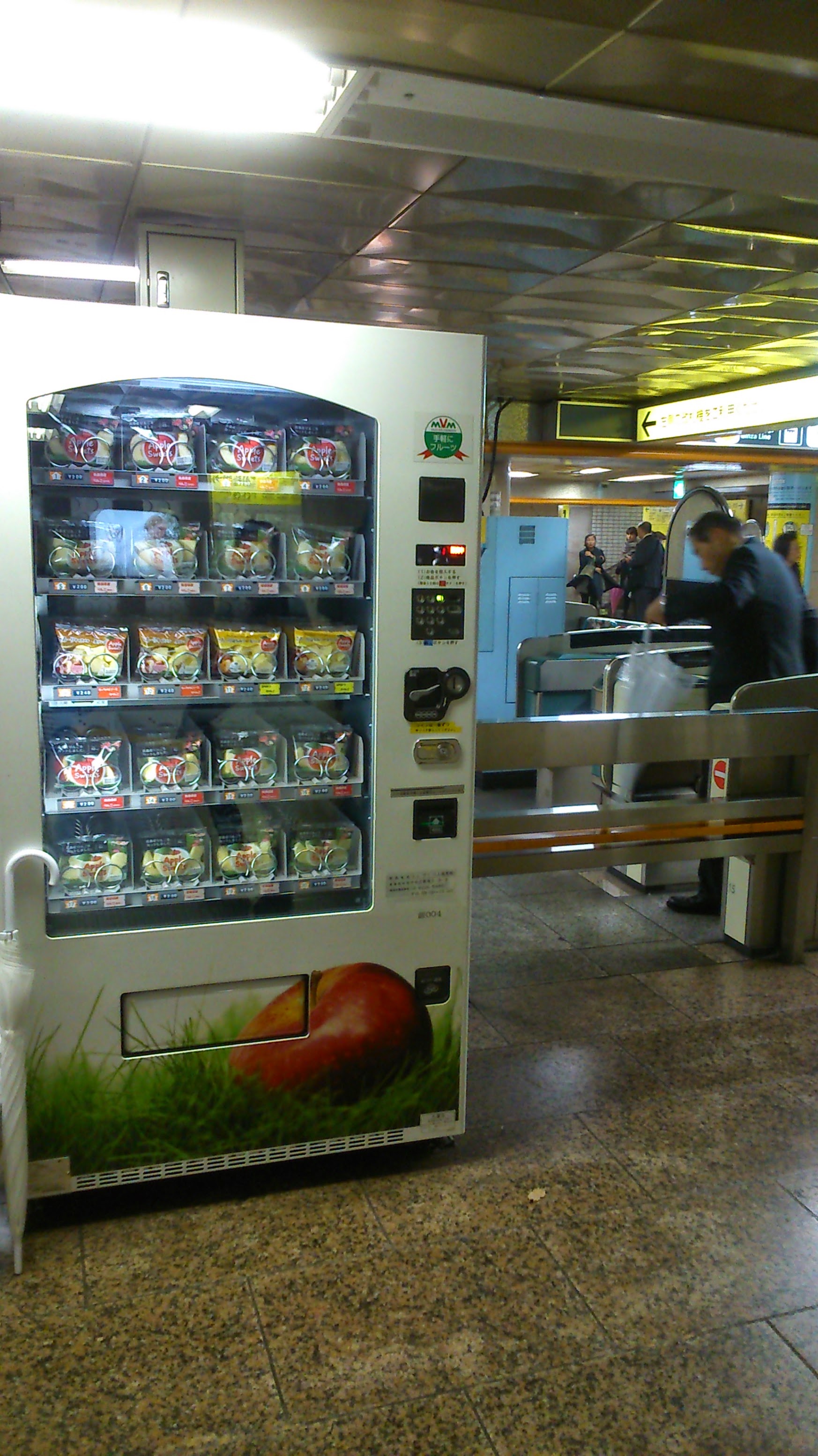 東京は銀座の、多くの人々が行き交う地下鉄駅で見かけた、カットリンゴの自動販売機です。