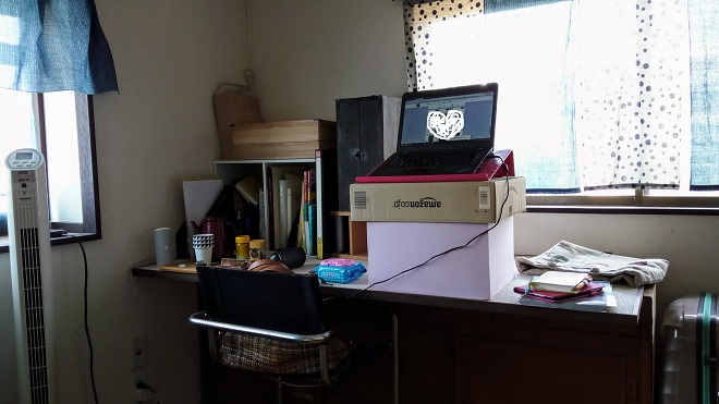 プネーの自宅では、電子ピアノを台にしたスタンディングデスク環境で時々仕事をしているが、福岡でも道具入れやアマゾンの配送ボックスなどを駆使して構築してみた。