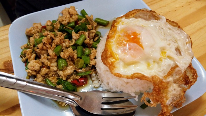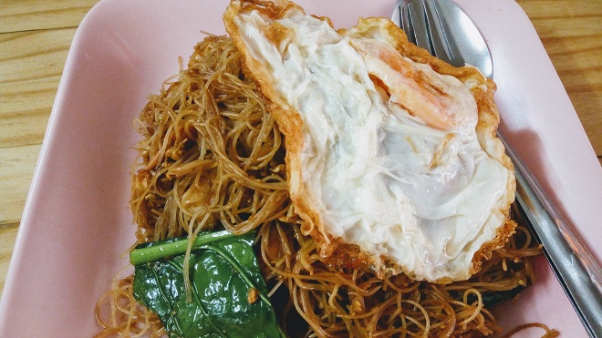 エビ入り醤油炒め春雨に、40バーツで目玉焼きをトッピング。