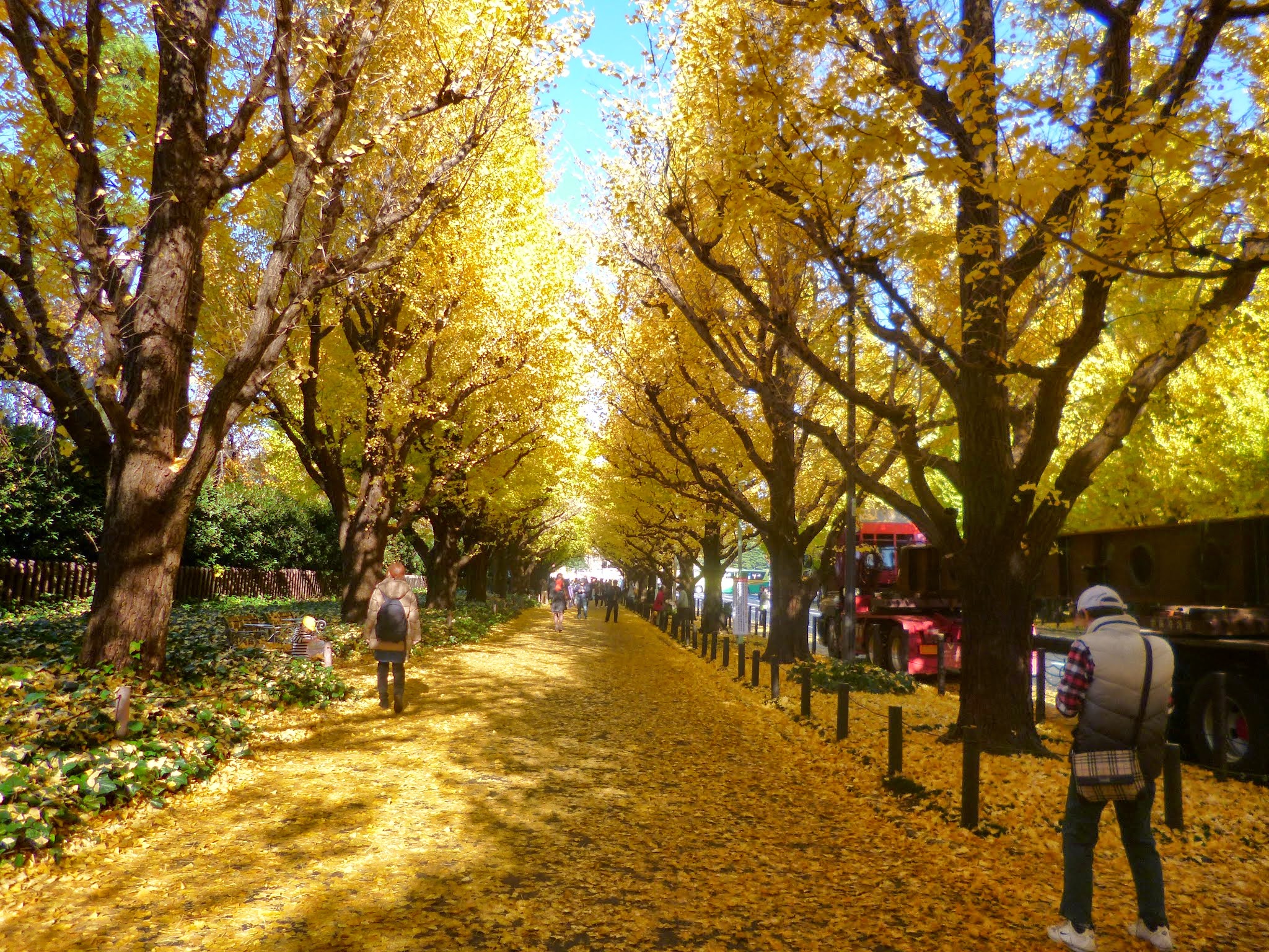 黄色いトンネルに黄色い絨毯が美しい、神宮外苑の銀杏並木です。